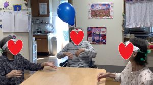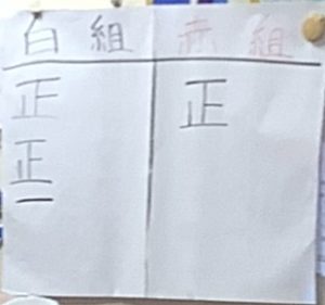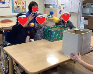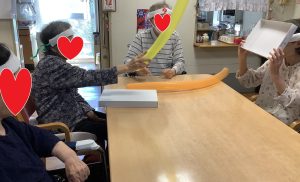 秋といえば運動会ということで先日、運動会を行いました。赤チームと白チームで別れてラジオ体操から始め、選手宣誓も入居者様にして頂き、玉入れ、風船バレー、叩いてかぶってじゃんけんポンの競技で見事、白チームの優勝で盛り上がりました。