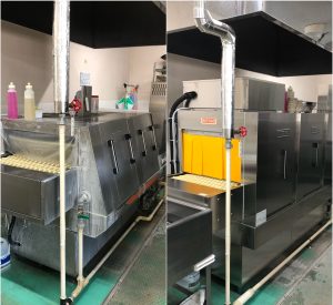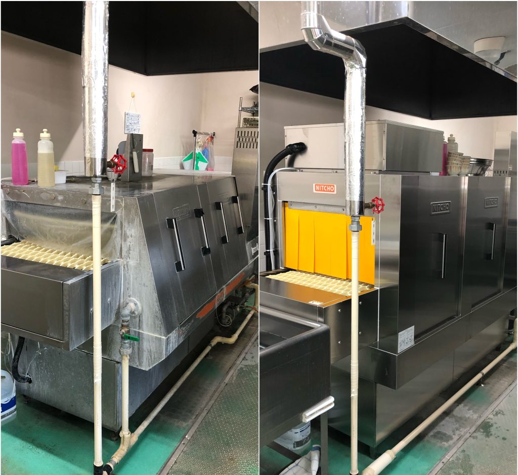 洗浄機は朝昼夕と使用するので、作業は専門業者の方々に夕食後に行っていただき、私たちは翌日の朝、新しいものと対面しました。befor→afterの写真です。