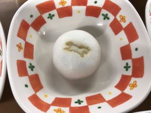 おやつは今年の干支「馬」の焼き印の入った干支万十でした。